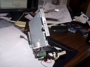 The obvious main difference between the storage schemes boiled down to access speed, latency, write speed, media handling, and the amount of data you can have online at a time. I didn’t want to have to handle CD-R discs, risking damage, and, I didn’t want to have to swap them in or out often. While filesystems such as mediadatabase or hierachical storage file system exist, and could be used (or modified) to run an active filesystem on such a device, the extreme latency, low access speeds, and small capacity of single discs make this a less than perfect option. However, a device such as this is well suited as an automated backup system – the 101 disc change would hold 70.7GB on CDR before compression. The option to simply upgrade the unit to a DVD-R (or dual layer) drive when cost effective would further expand the backup capacity to 474GB (or 949GB)! Needless to say, years after the initial idea, I was still thrilled to redesign the disc changer robotics to accommodate a highspeed data drive and computer control.